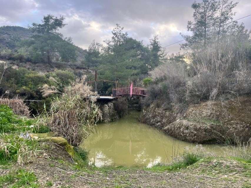 (25,000 L, 8,000 L, and 6,000 L), a registered natural spring, and running water connected