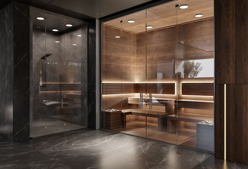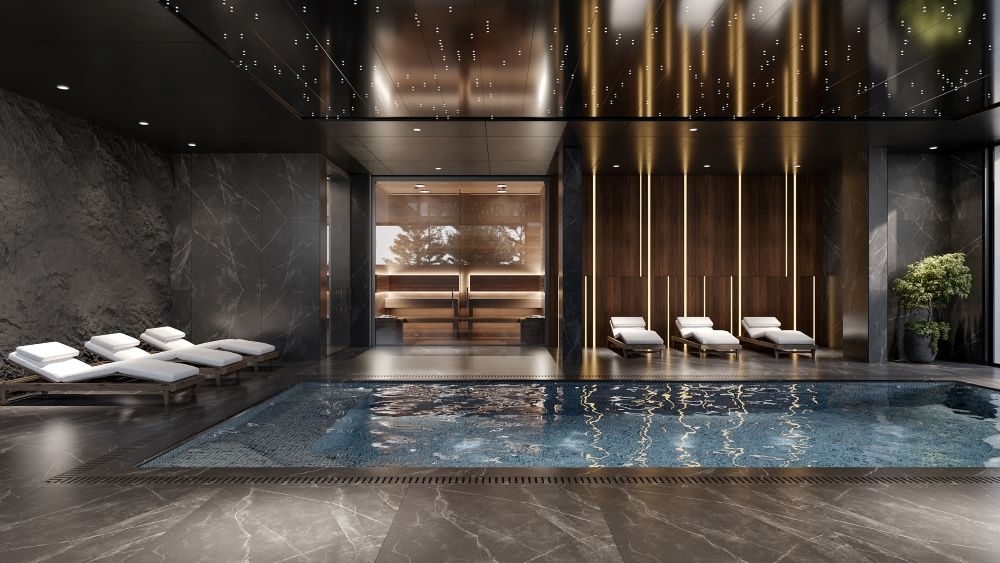Wellness centre with swimming pool, sauna, bathrooms and gym.
