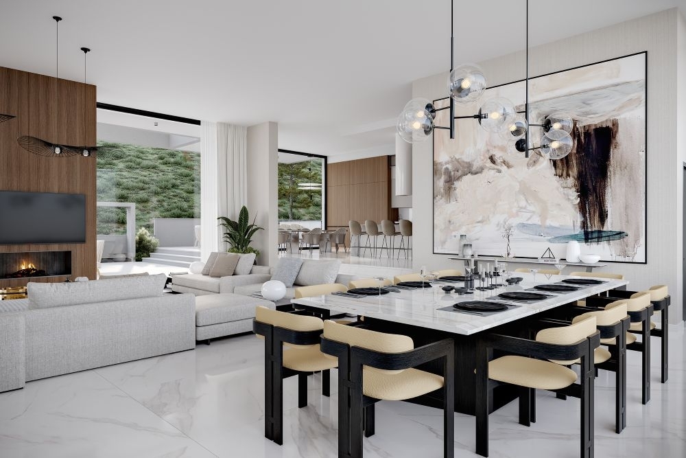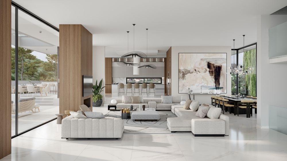 Open plan living area with dining and kitchen